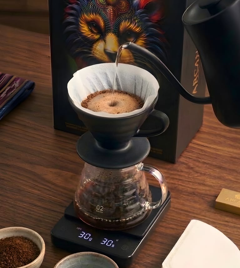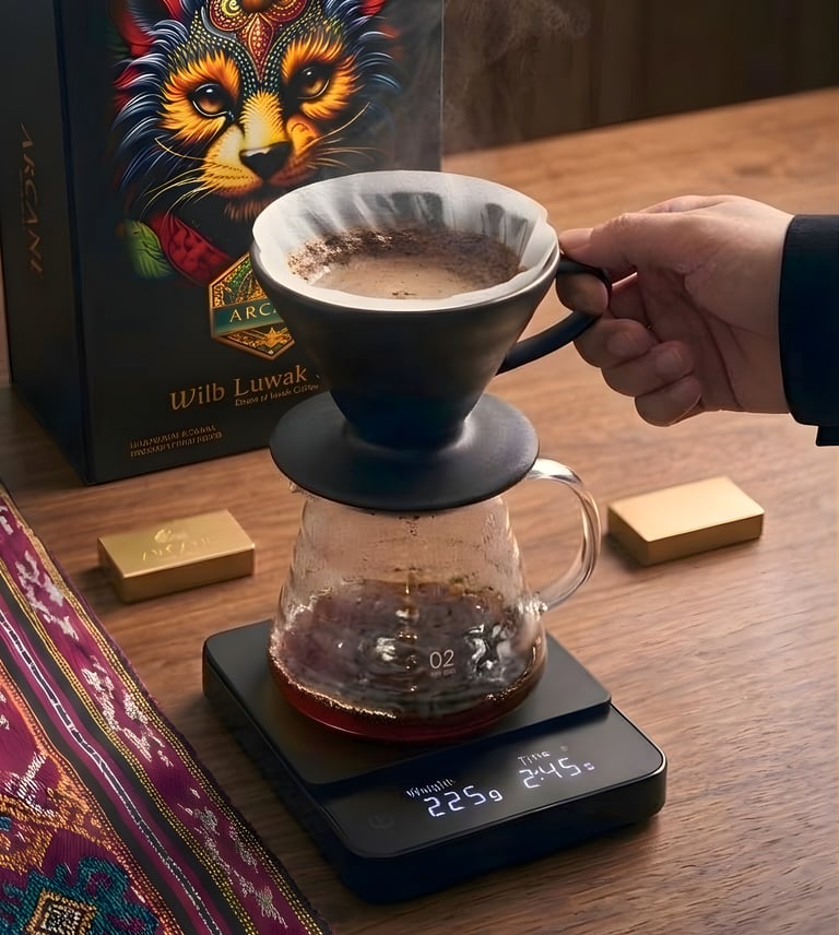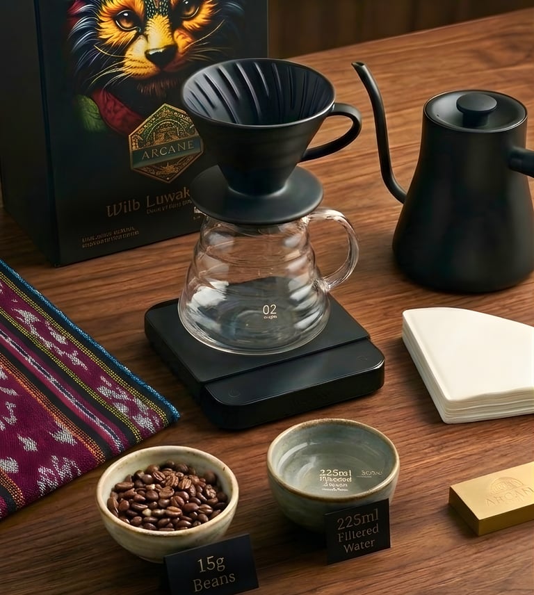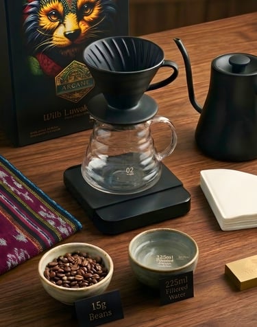 Coffee: 15g of Arcane Island beans (medium-fine grind, like sea salt).